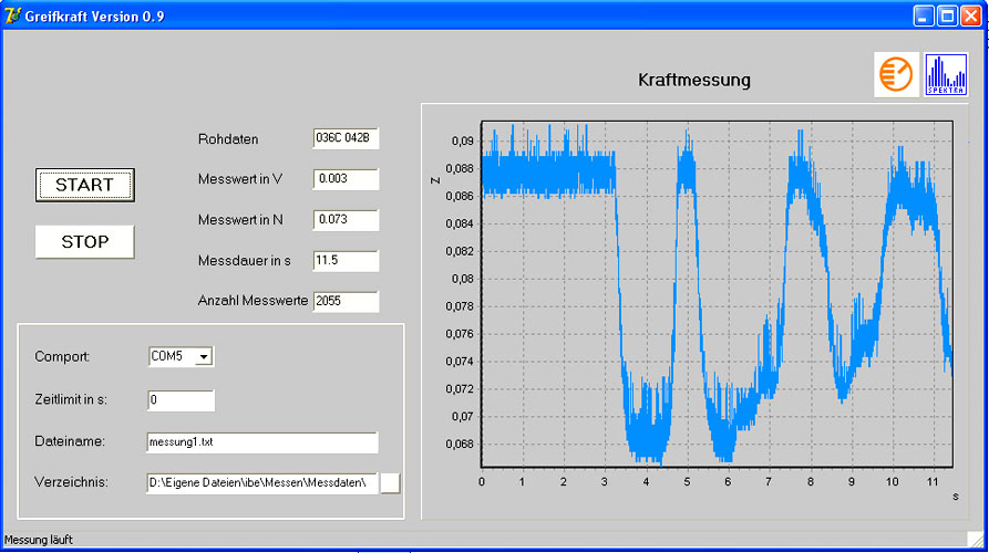 Das Bedienkraft-Messsystem wird für die Erfassung von Bedien- oder Schalterkräften von handgehaltenen Arbeitsmitteln eingesetzt. Dabei können die Flächen auch uneben sein und/oder müssen nicht parallel zueinander stehen.